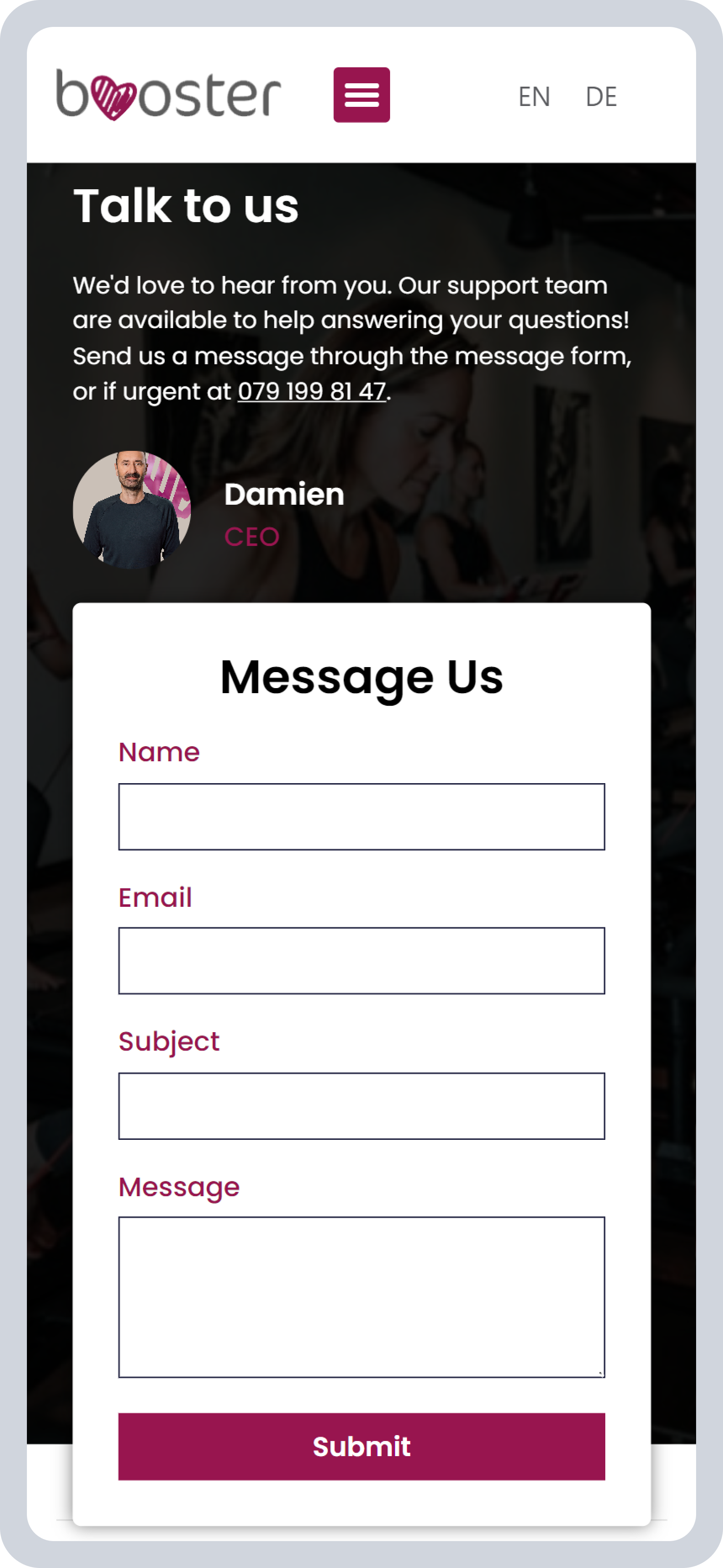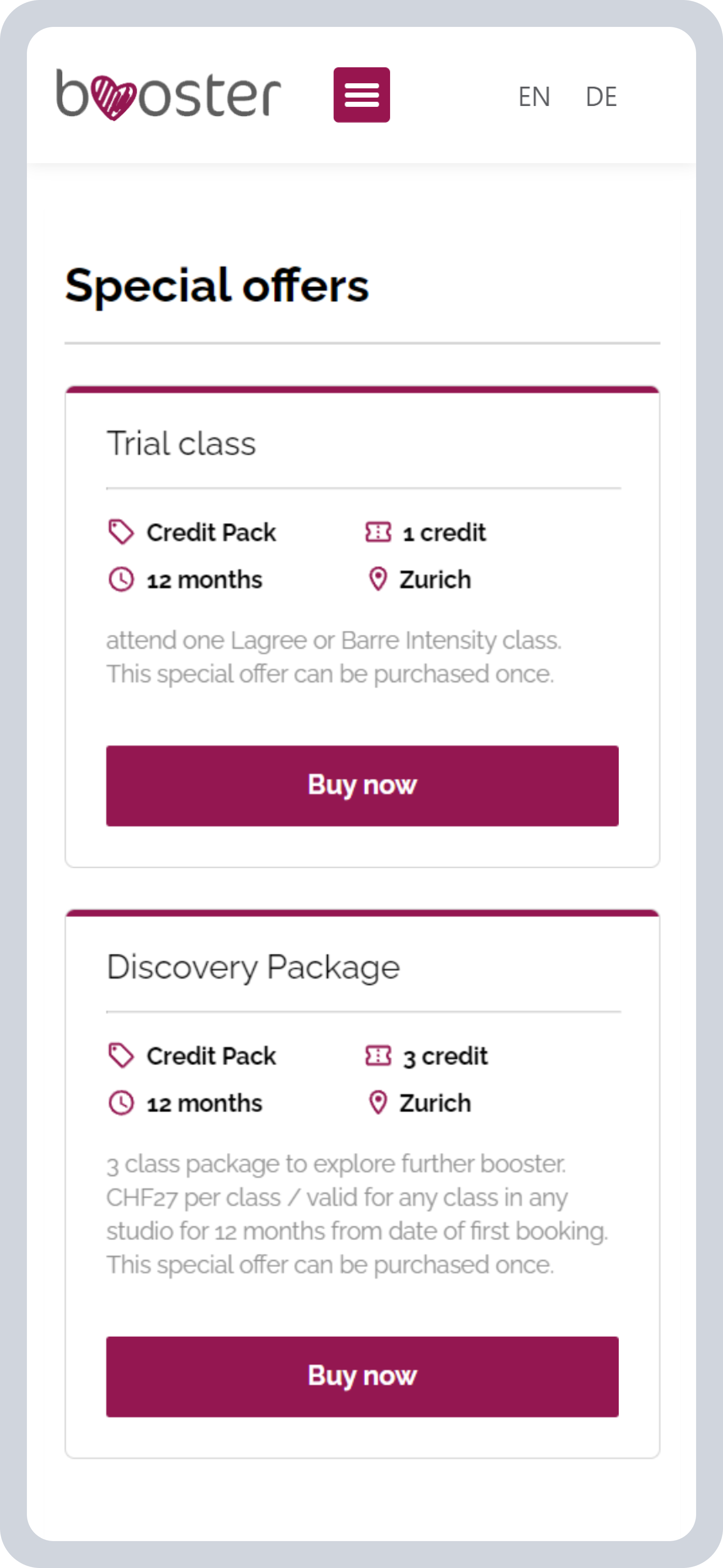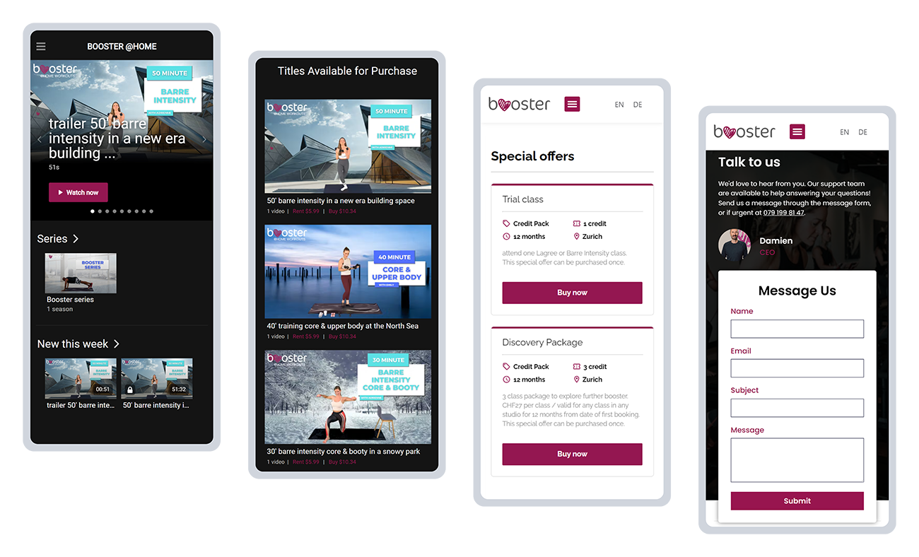 Pour la plateforme de réservation mobile de Booster Transform, nous nous sommes attachés à offrir une expérience utilisateur fluide et intuitive. Le placement et l’espacement des boutons ont été optimisés pour faciliter la navigation, tandis que des images soigneusement sélectionnées mettent en valeur l’atmosphère du studio et renforcent l’engagement. Chaque élément de conception a été adapté pour une réactivité mobile optimale, garantissant une navigation et des réservations sans effort. Le résultat est une expérience mobile fluide, visuellement attrayante et conviviale.