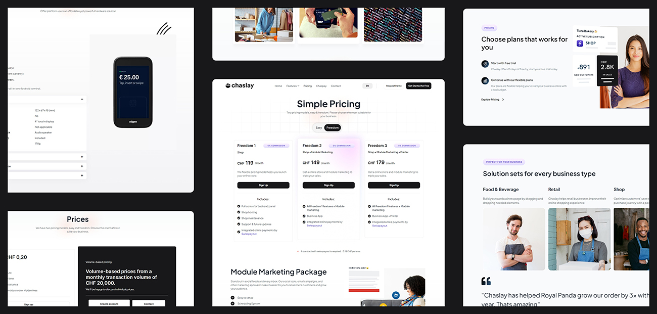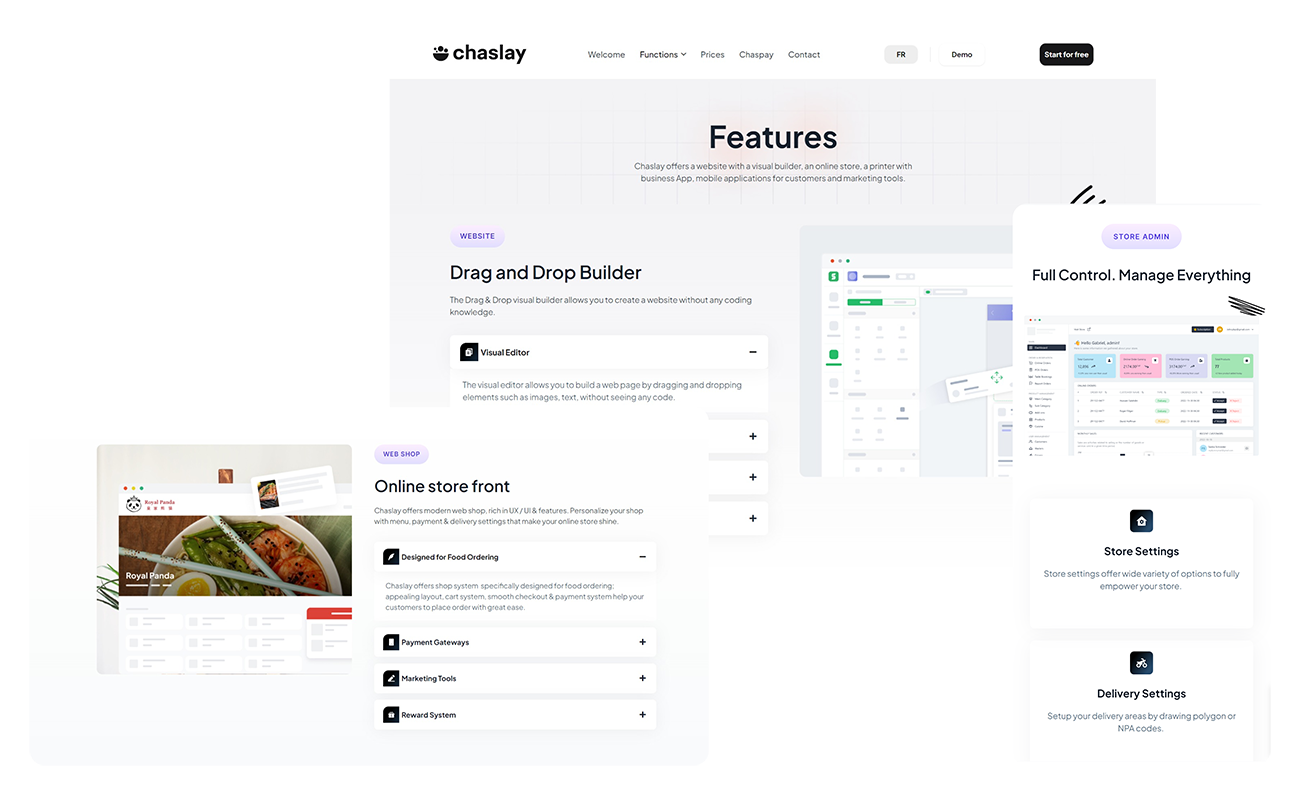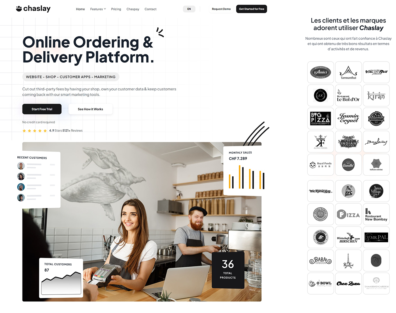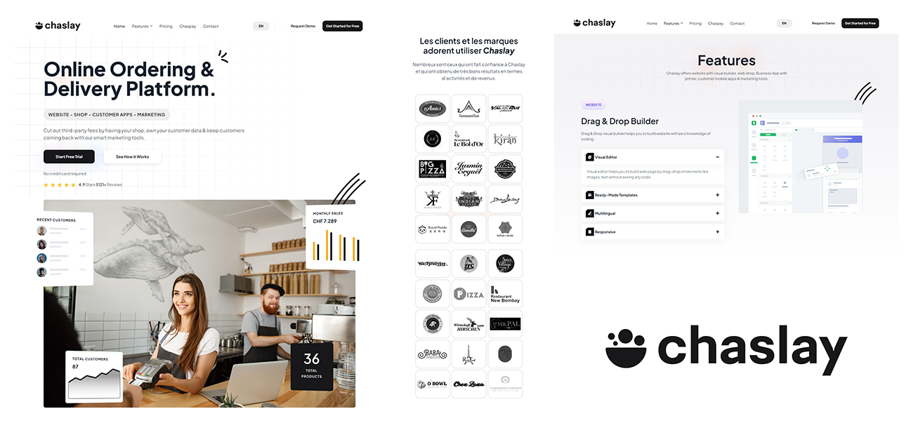 Chaslay est une plateforme SaaS suisse basée à Neuchâtel, spécialisée dans les solutions sur mesure de commande et de livraison en ligne pour les restaurants, les épiceries et les hôtels. Elle permet aux entreprises de disposer de leur propre vitrine numérique, en leur offrant des fonctionnalités telles que la création de pages par glisser-déposer, des applications clients, des commandes en ligne, la livraison et le retrait, la réservation, les commandes par QR code, le marketing par e-mail/SMS, les coupons, les cartes-cadeaux et les analyses, le tout dans un système unifié.