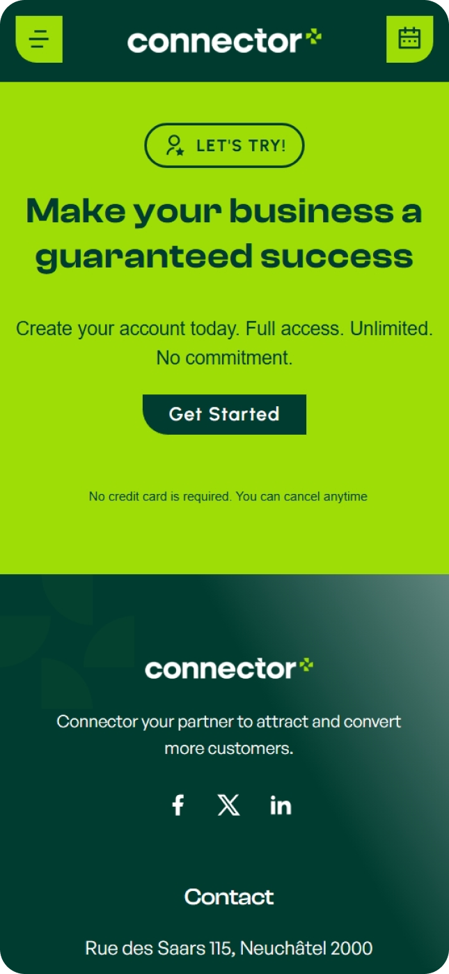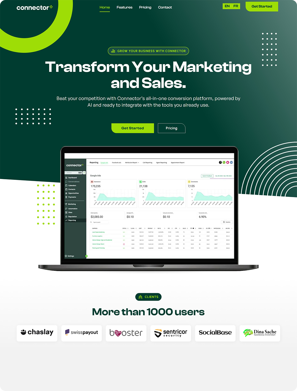 Le nouveau site communique clairement et efficacement les capacités tout-en-un de Connector, permettant aux entreprises de gérer le marketing, les ventes et les relations avec les clients en un seul endroit. En présentant des niveaux de prix transparents et des ensembles de fonctionnalités robustes, le site Web a amélioré la compréhension de l’utilisateur, la clarté de la conversion et a positionné Connector comme une solution crédible et efficace pour les entreprises suisses.