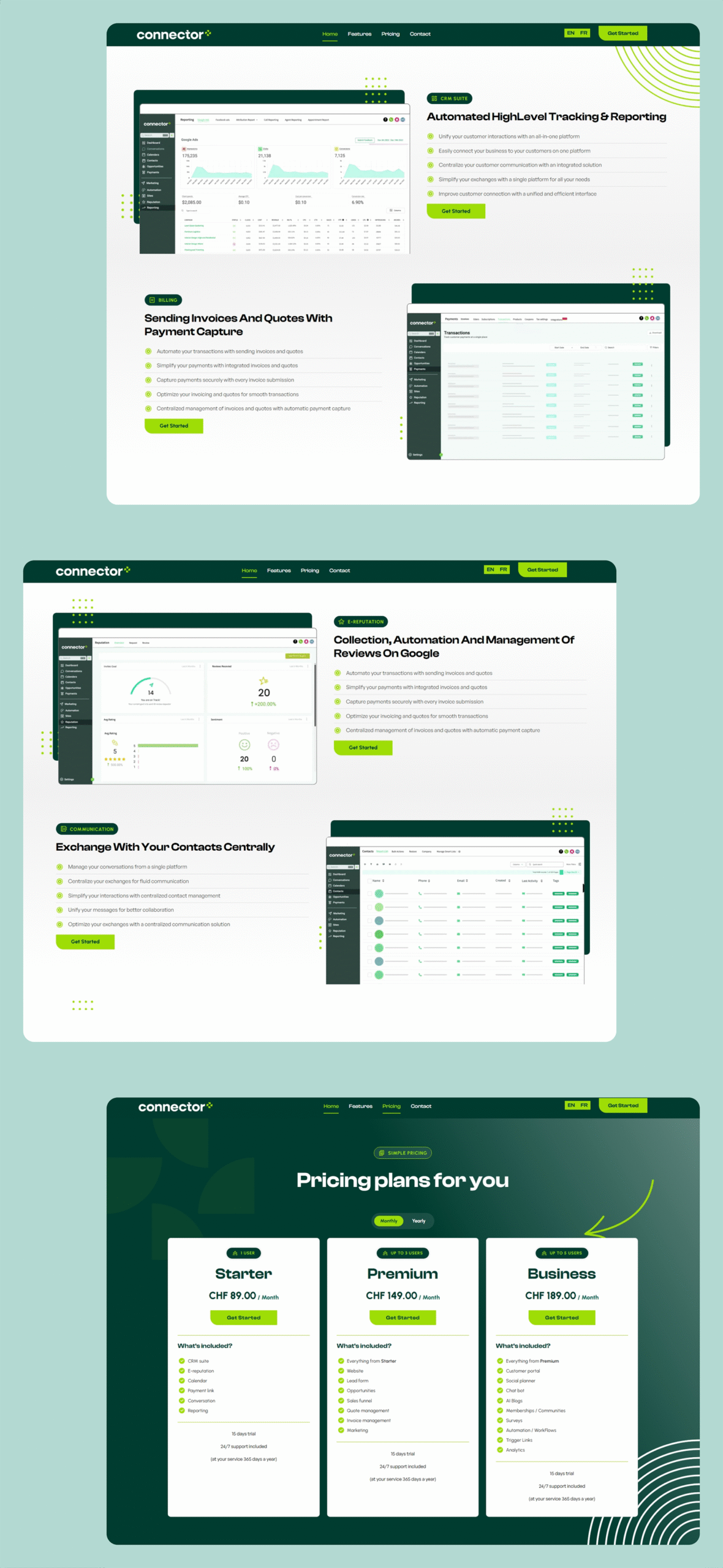Création d’un site complet décrivant les principales fonctionnalités de Connector : Outils CRM, marketing par courriel/SMS, automatisation de la réputation, création de sites Web et d’entonnoirs, facturation/devis, planification, widget de clavardage et planification des médias sociaux. Chaque plan (Starter, Premium, Business) est détaillé en termes de fonctionnalités, de tarifs (mensuels/annuels) et d’offres d’essai, ce qui permet aux visiteurs de comparer et de sélectionner facilement le bon niveau.