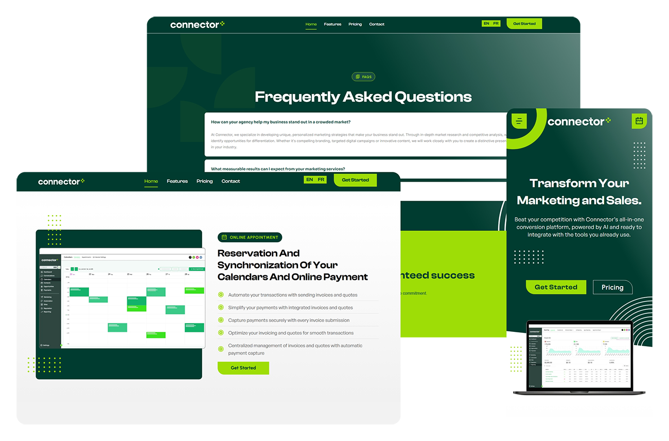 Nous avons développé un site web WordPress rationalisé qui présente clairement l’ensemble des fonctionnalités de Connector – en mettant l’accent sur l’automatisation, la suite CRM, la facturation, les outils d’e-réputation, le planificateur social et les fonctionnalités de pipeline de vente. Le site utilise une mise en page et un message intuitifs pour guider les entreprises à travers les offres par niveau de plan (Starter, Premium, Business) et mettre l’accent sur la facilité d’utilisation, les intégrations et l’assistance 24 heures sur 24, 7 jours sur 7.