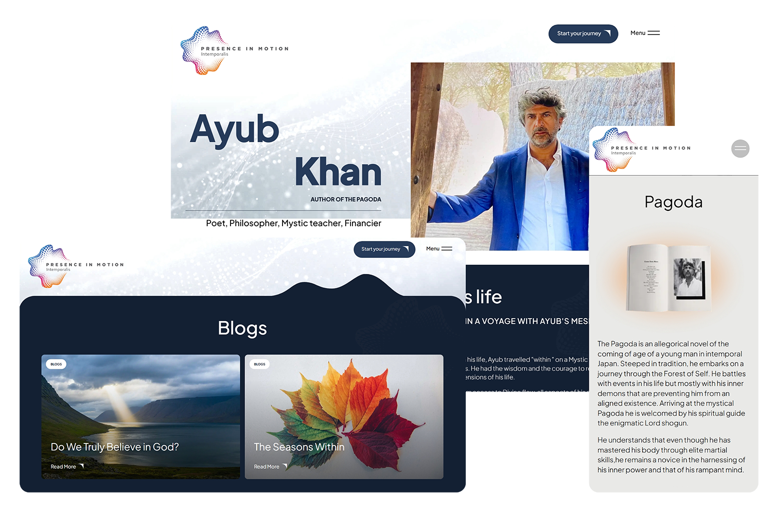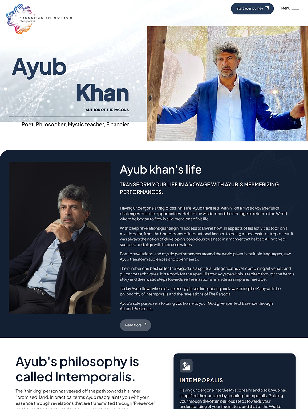 Presence in Motion est la plateforme spirituelle d’Ayub Khan, un poète mystique, philosophe et éducateur dont le roman spirituel à succès The Pagoda partage son chemin vers la réalisation de soi. Grâce à la philosophie de l’Intemporalis (« au-delà du temps »), Ayub guide les autres vers la présence divine par le biais de performances poétiques, d’enseignements mystiques et d’expériences immersives. La marque facilite la transformation spirituelle grâce à des éléments interactifs tels que des académies guidées, des programmes de pleine conscience en entreprise et des spectacles mystiques.