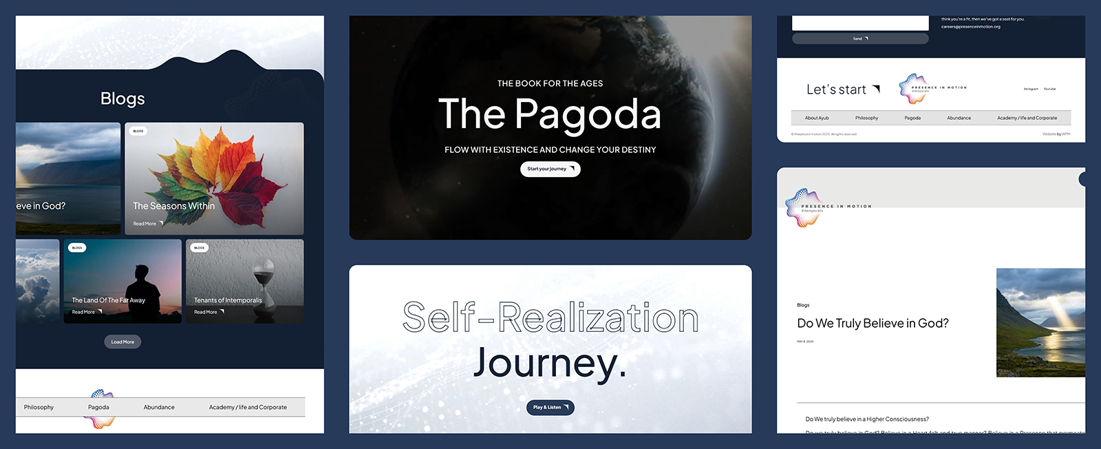 Nous avons conçu un site WordPress moderne et élégant qui reflète l’éthique mystique d’Intemporalis et de la Pagode. La plateforme présente des sections de contenu attrayantes telles que la philosophie, l’Académie de la Pagode, l’abondance, les médias et la présence en mouvement, toutes organisées pour guider les visiteurs à travers le récit spirituel et les offres d’Ayub. La conception visuelle met l’accent sur la sérénité, la clarté et une expérience utilisateur intuitive alignée sur le ton spirituel de la marque.